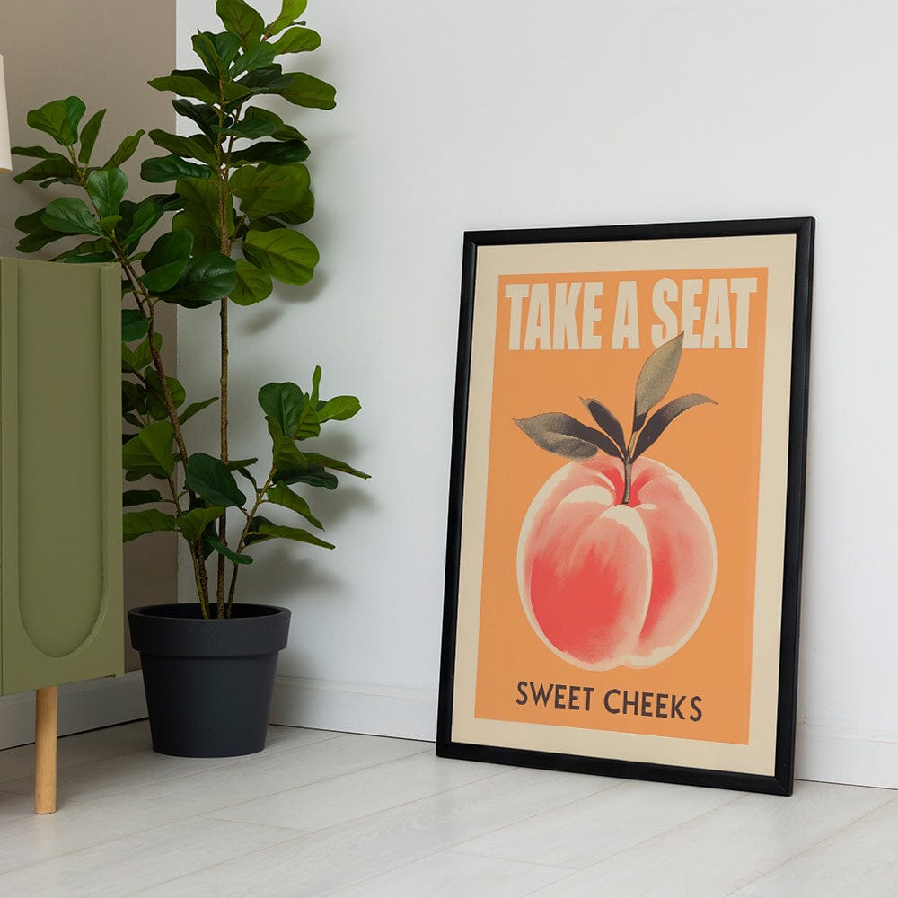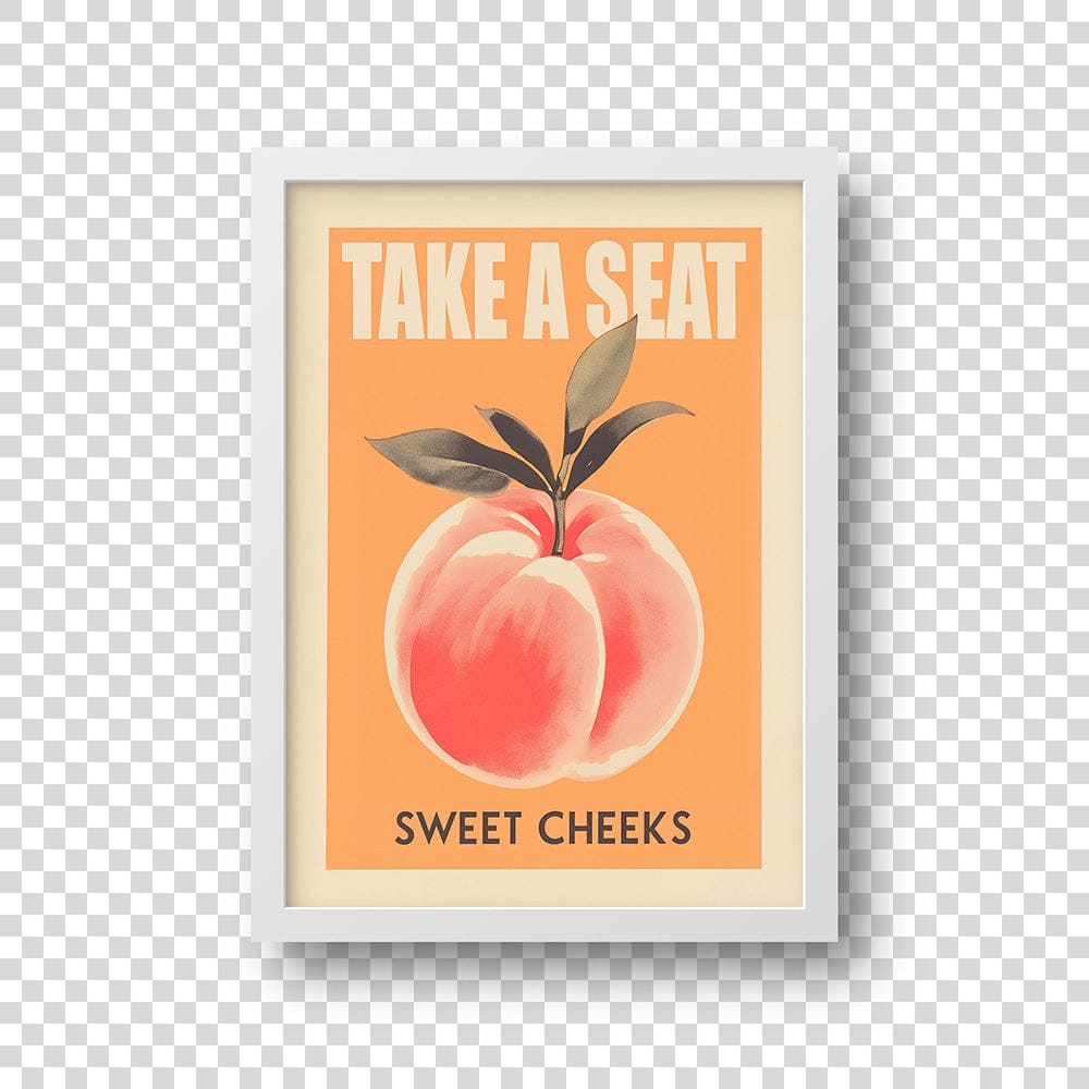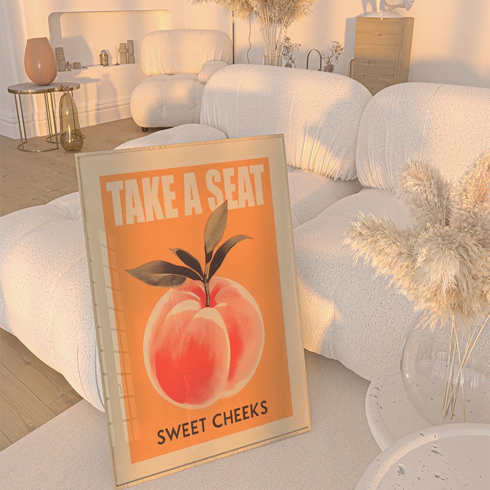 This art piece, with its bold peach and vintage-inspired typography, adds a cheeky, lighthearted feel to any room. The warm orange tones and lush, lifelike peach create an inviting vibe, blending humor and style effortlessly. It’s a wink and a smile, a piece that sparks conversation and brings joy with every glance.