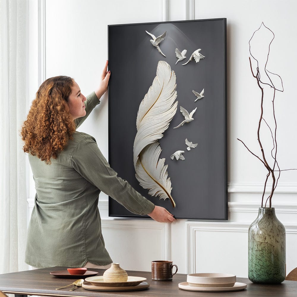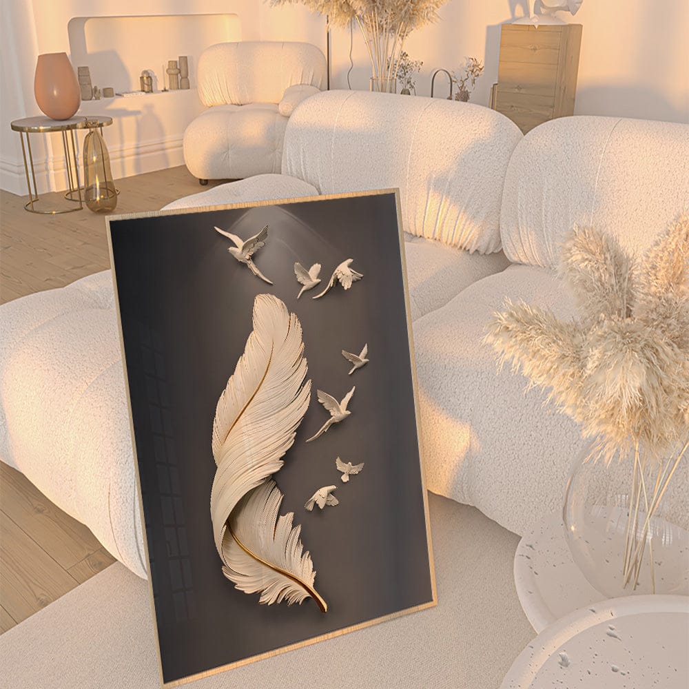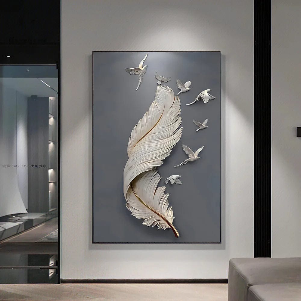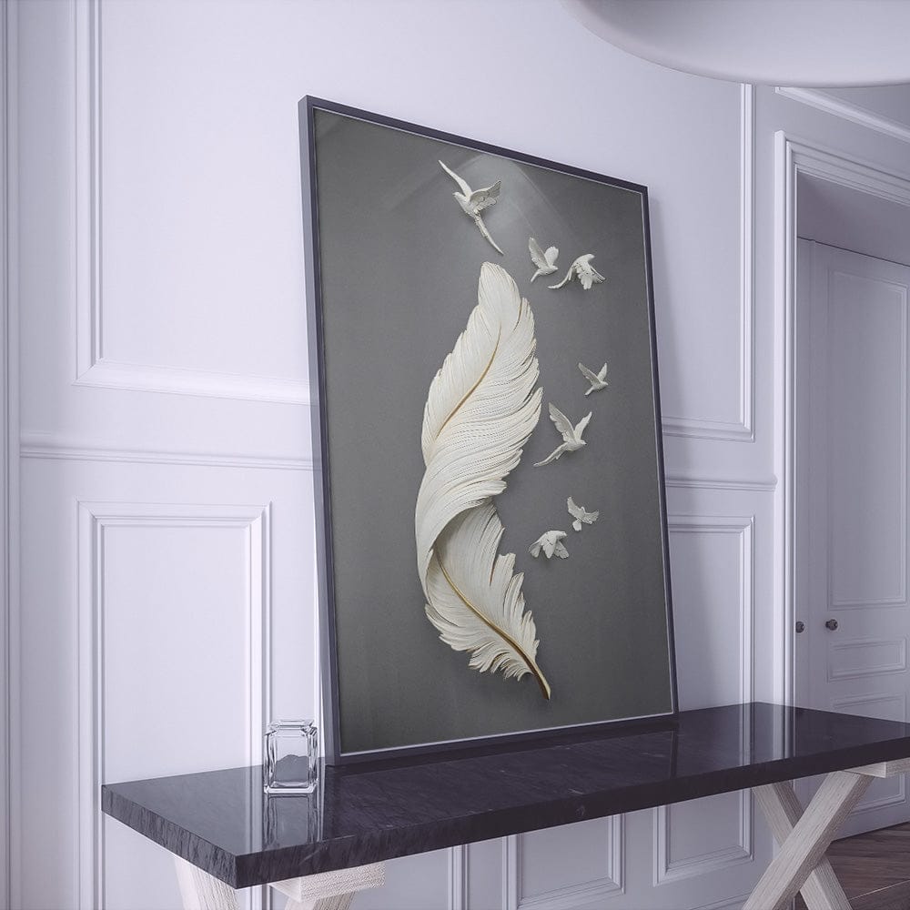 A pristine white feather floats effortlessly, surrounded by doves soaring against a serene sky-blue backdrop. Each delicate brushstroke whispers calm, offering a tranquil escape into a world of harmony.