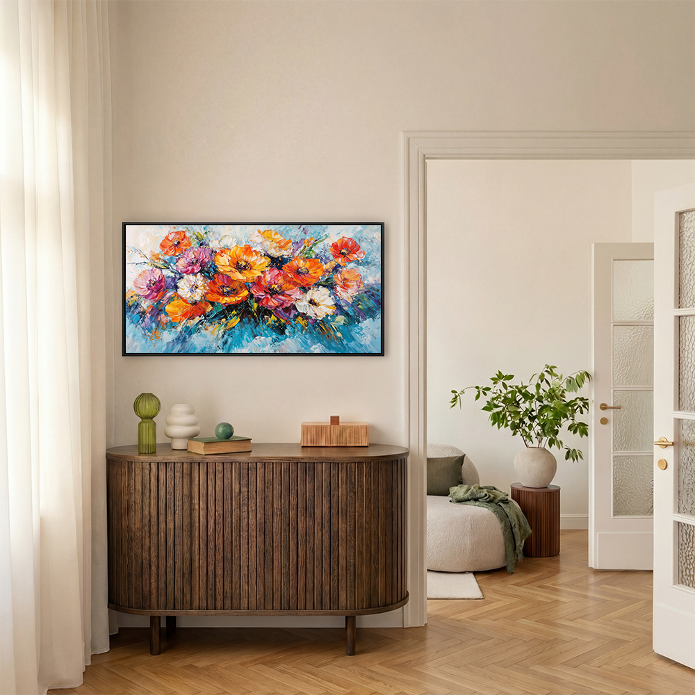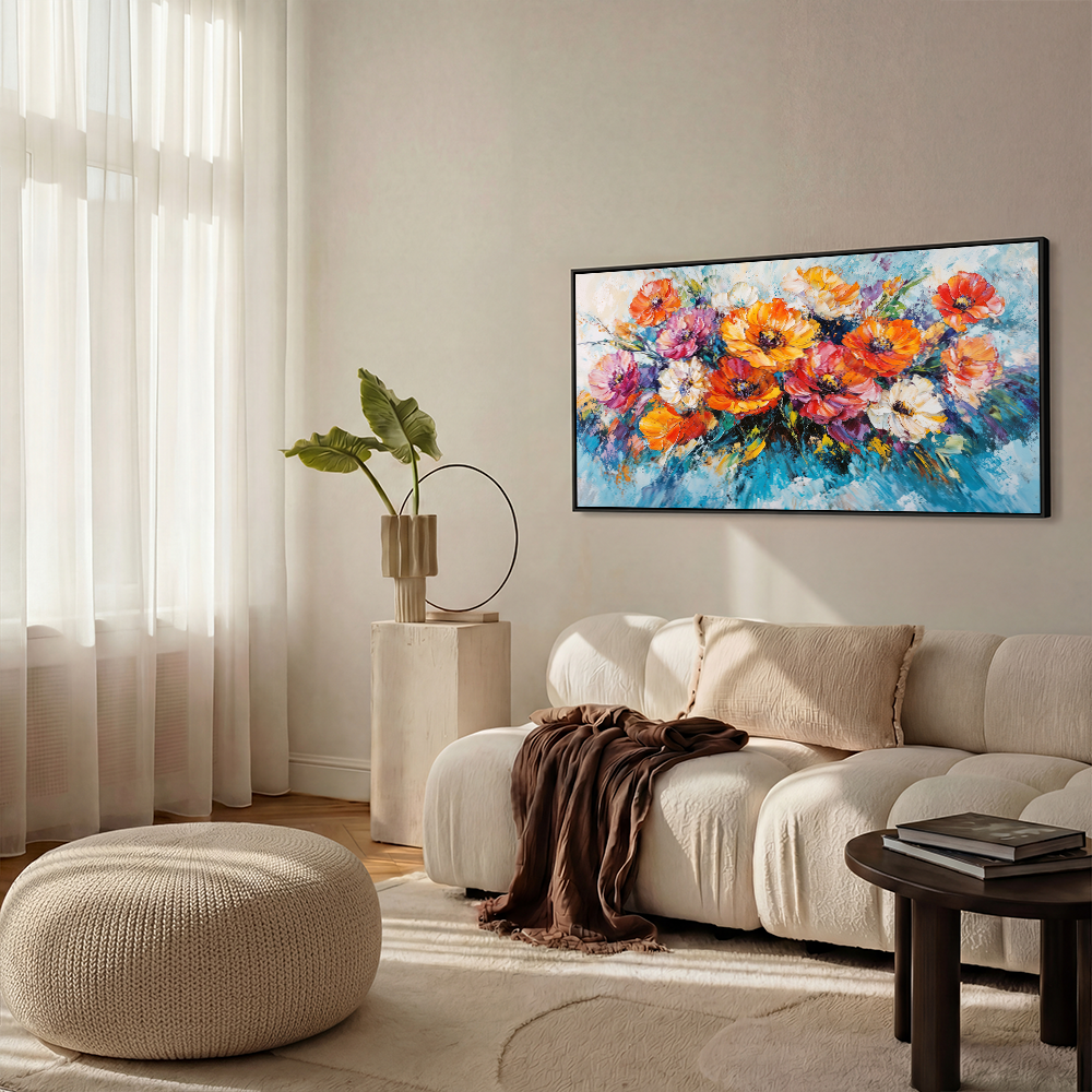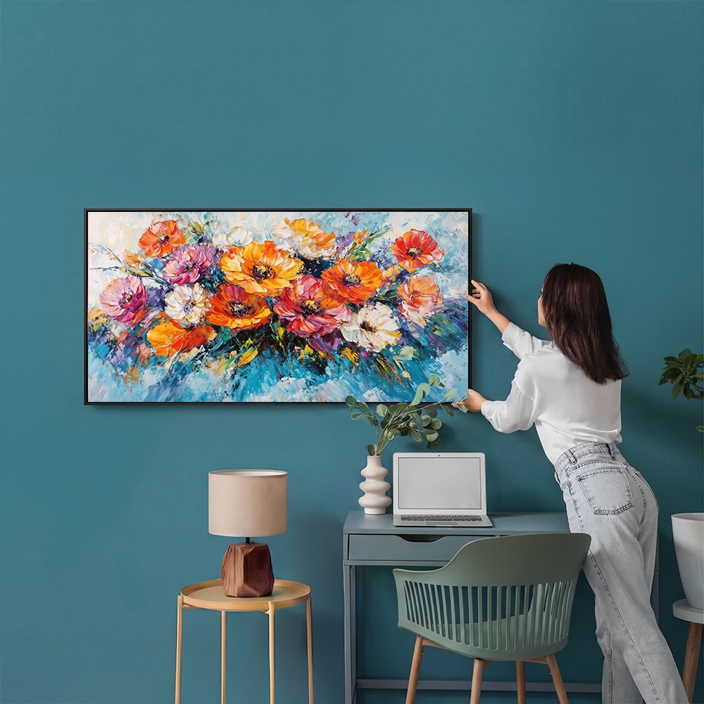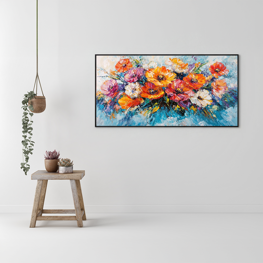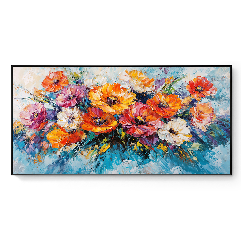 This exuberant creation captures the essence of a vibrant garden in full bloom, where each daisy seems to dance in the gentle breeze. Let this artwork fill your space with uplifting energy, brightening your home with its lively, radiant palette. It invites a moment of pure joy, like a fresh breath of spring.