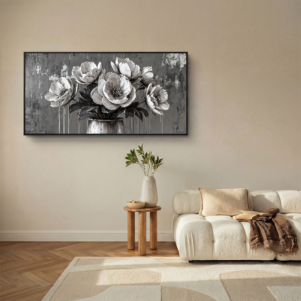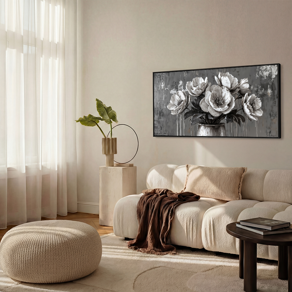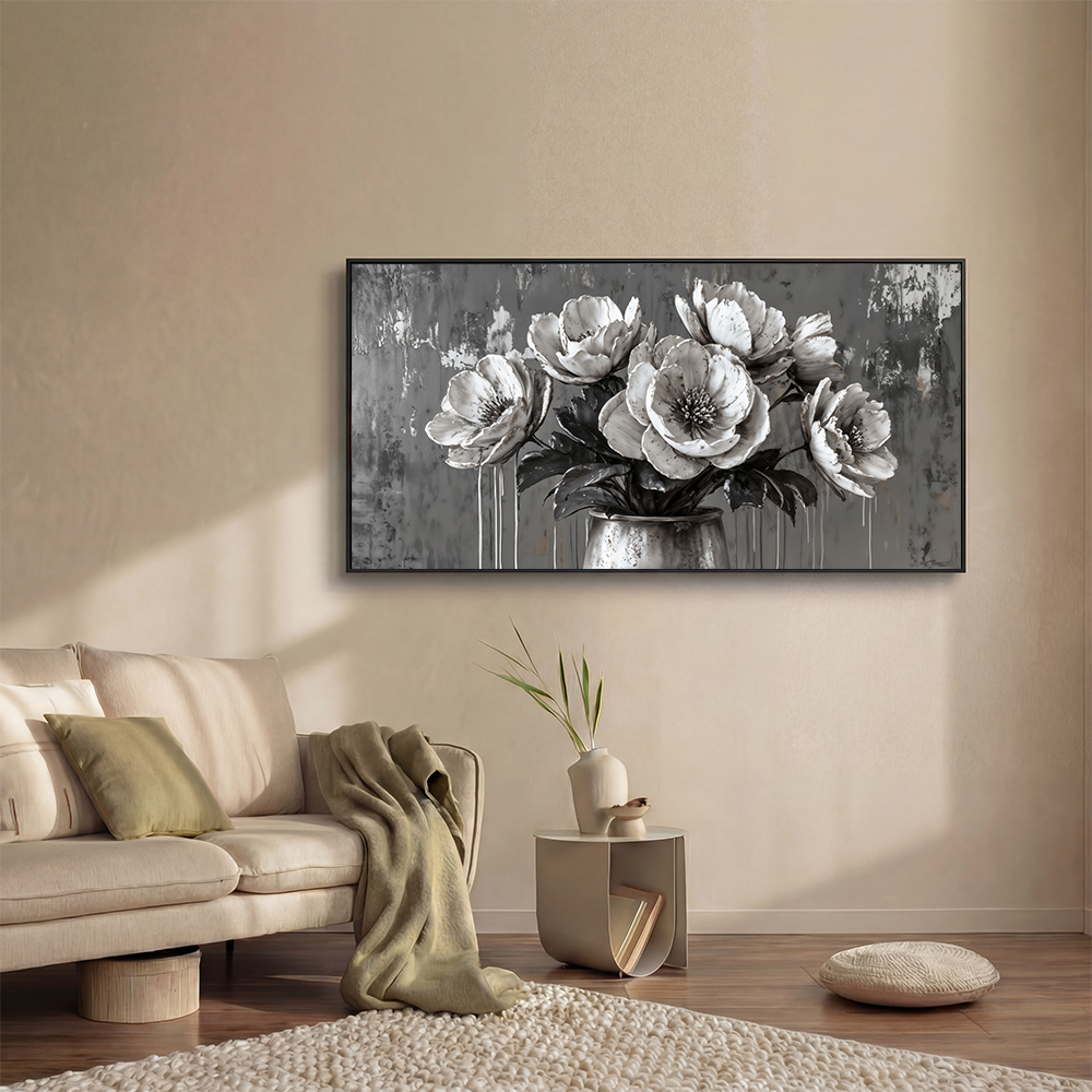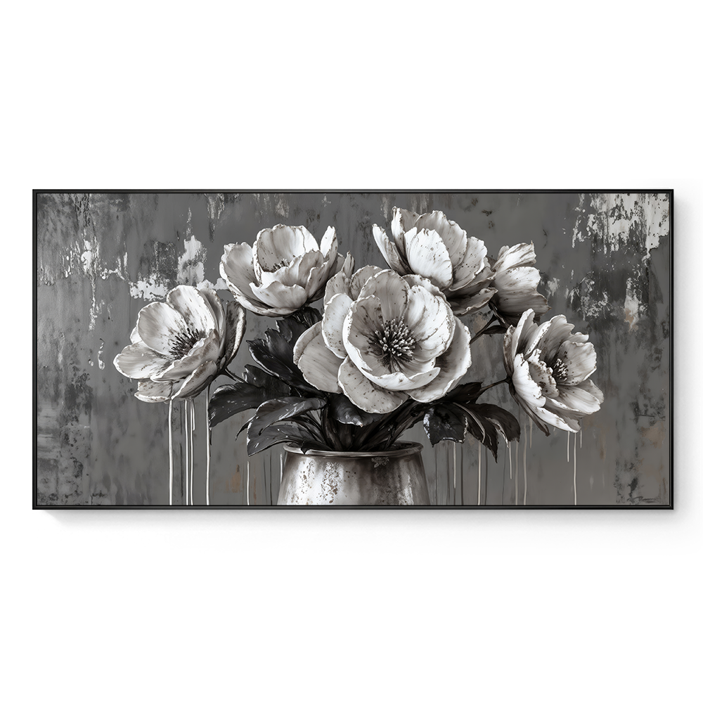 The soft grayscale palette is enhanced by subtle dripping textures, which add depth and a modern feel. Each petal appears almost sculpted, exuding quiet sophistication.
