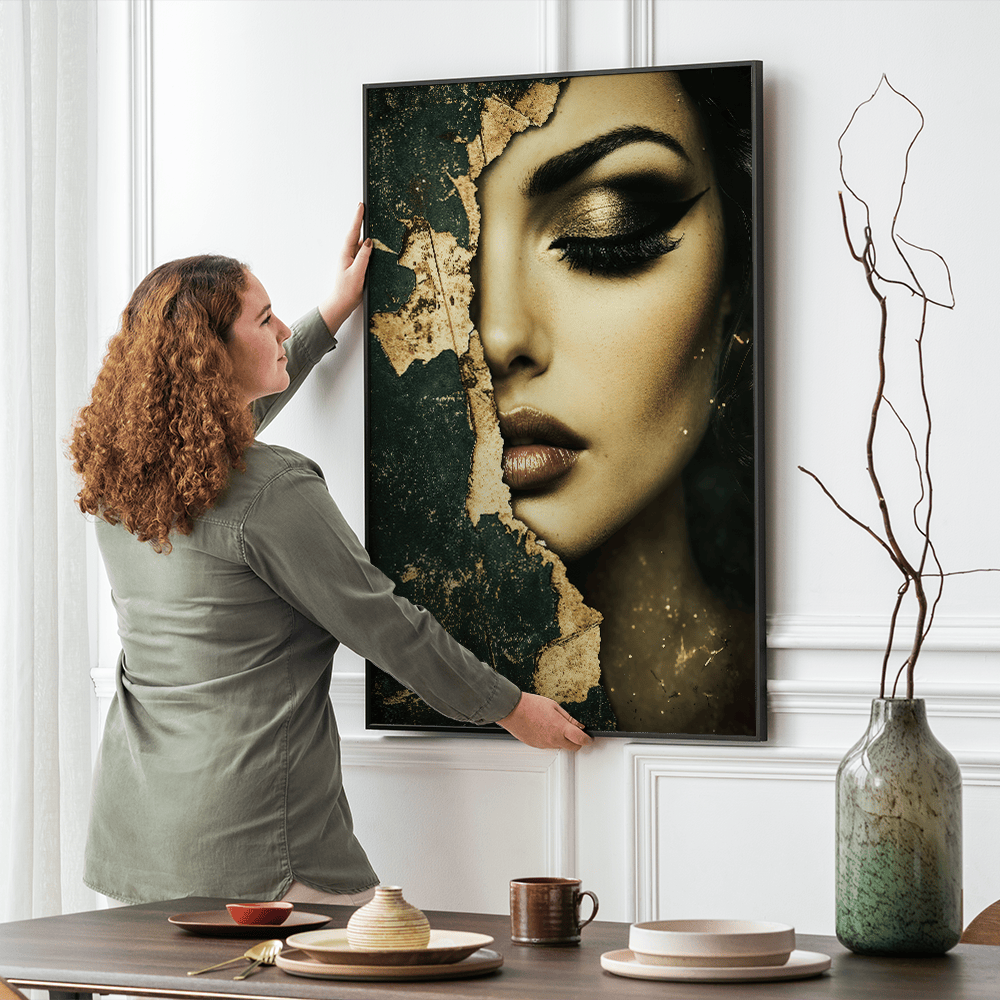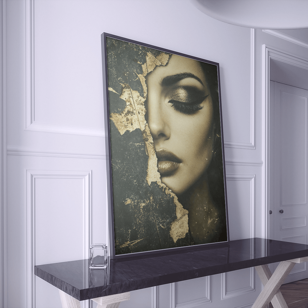 The artwork features a striking female portrait, with half her face subtly revealed through weathered golden textures and deep, dark tones. The interplay of metallic gold and muted green evokes both elegance and intrigue, making it impossible to look away.