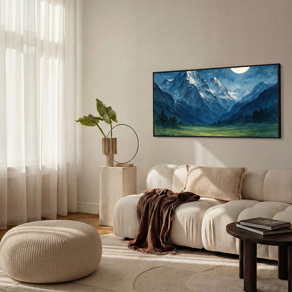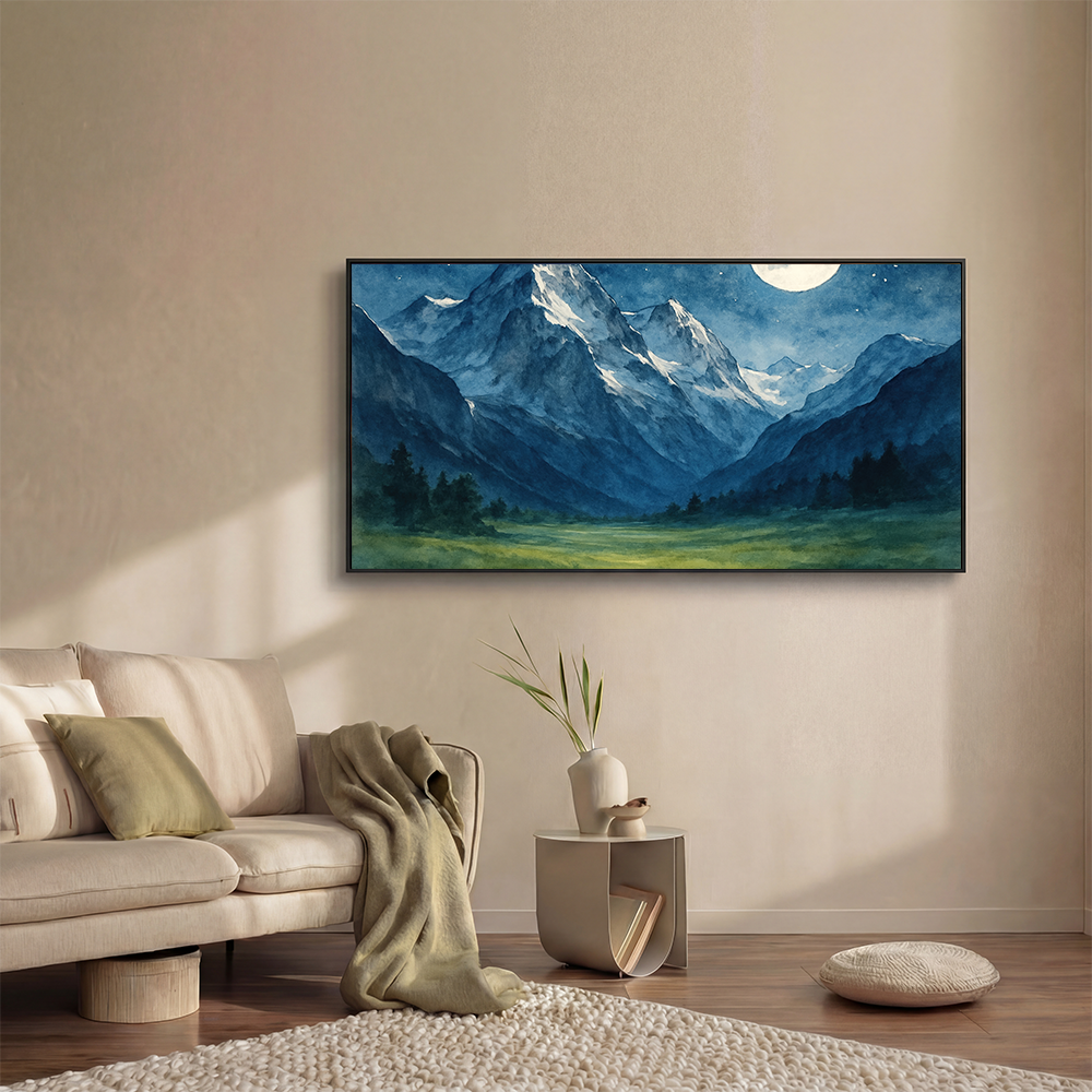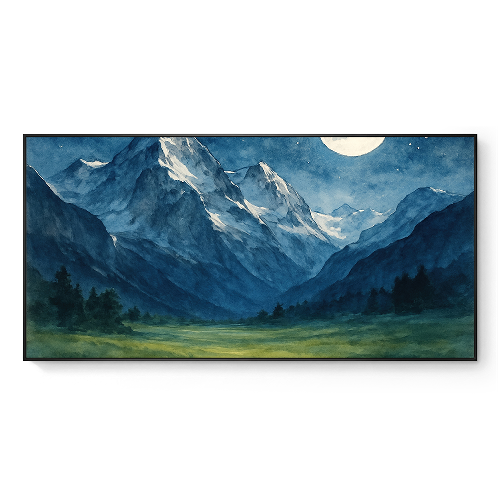 Moonlight glides over towering mountains, their snowy crowns gleaming against the deep indigo sky. Shadows drape the valleys below, while the quiet expanse of meadow glows softly under the silver light. The scene feels untouched and eternal, a world where stillness reigns beneath the stars.