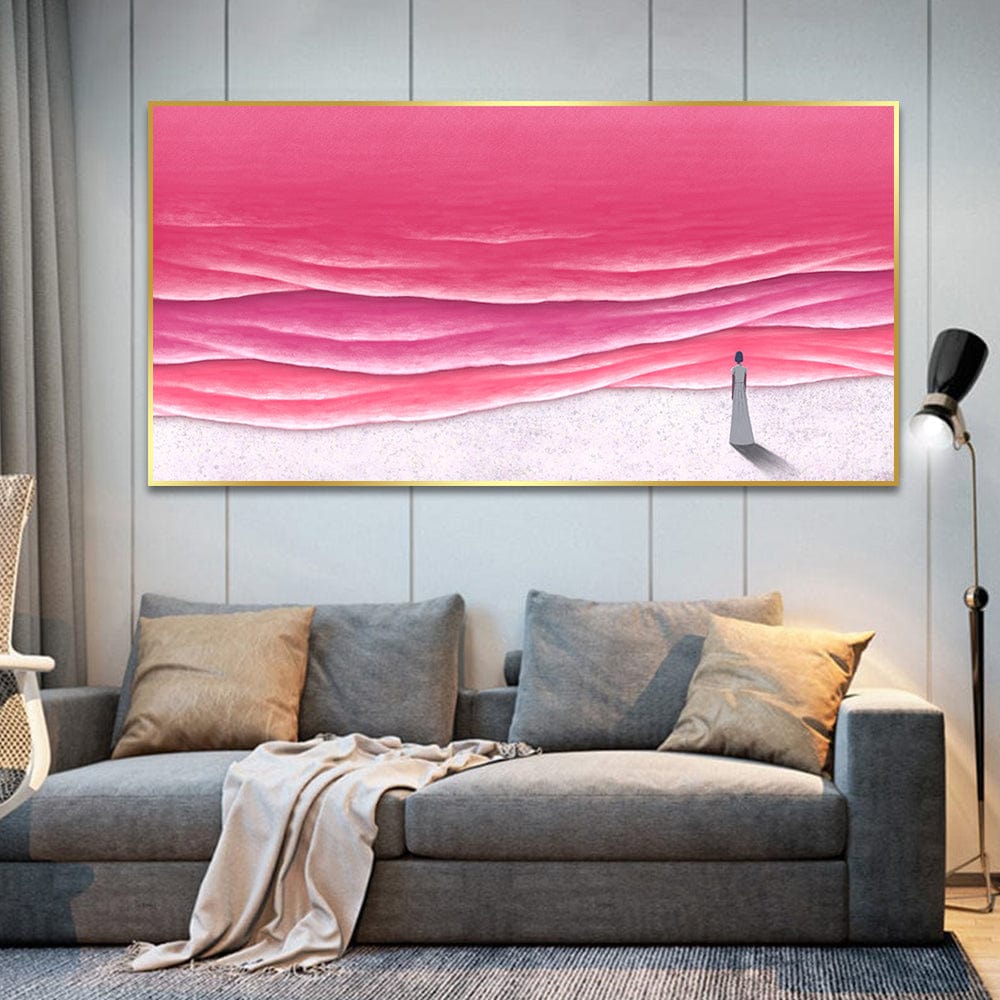 Let the vivid tones and poetic simplicity of this piece infuse your space with contemporary charm. Purchase this striking "Flamingo Waves" by Crib of Art today and invite a touch of surreal beauty into your home.
