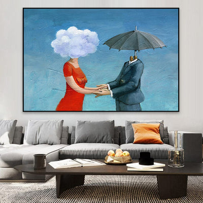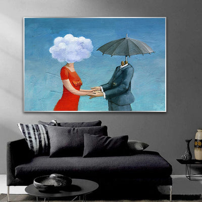 A cloud-headed woman in red holds hands with a suit-clad figure under a floating umbrella, their surreal connection painting a story of opposites harmonizing. The textured blue background adds depth, echoing the vastness of the sky.