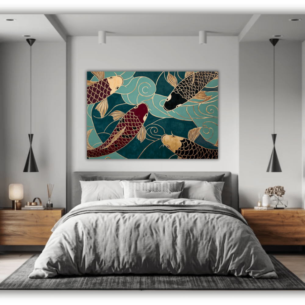 This striking artwork depicts golden koi swimming gracefully against teal waves, each curve and line detailed with precision. The rich red, black, and gold hues lend the piece a regal, timeless charm.