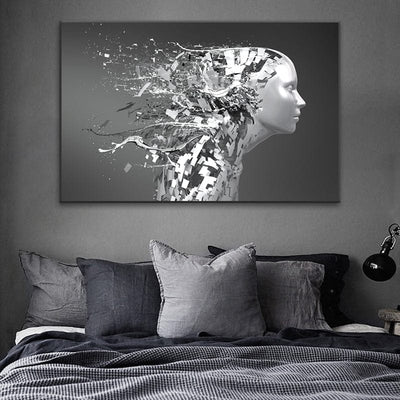 Step into the enigmatic world of "Sides of Me," a poignant portrayal of an android slowly disintegrating. This striking artwork invites you to explore the delicate balance between strength and vulnerability, the ephemeral nature of existence captured in every fragment.