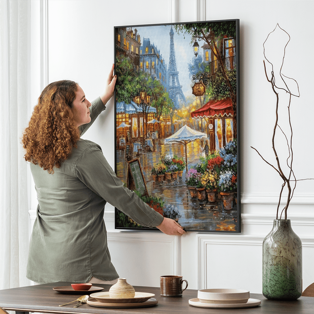 Alle unsere Rahmen verfügen über ein einfaches Montagesystem, mit dem Sie Ihr Gemälde an der Wand befestigen können.