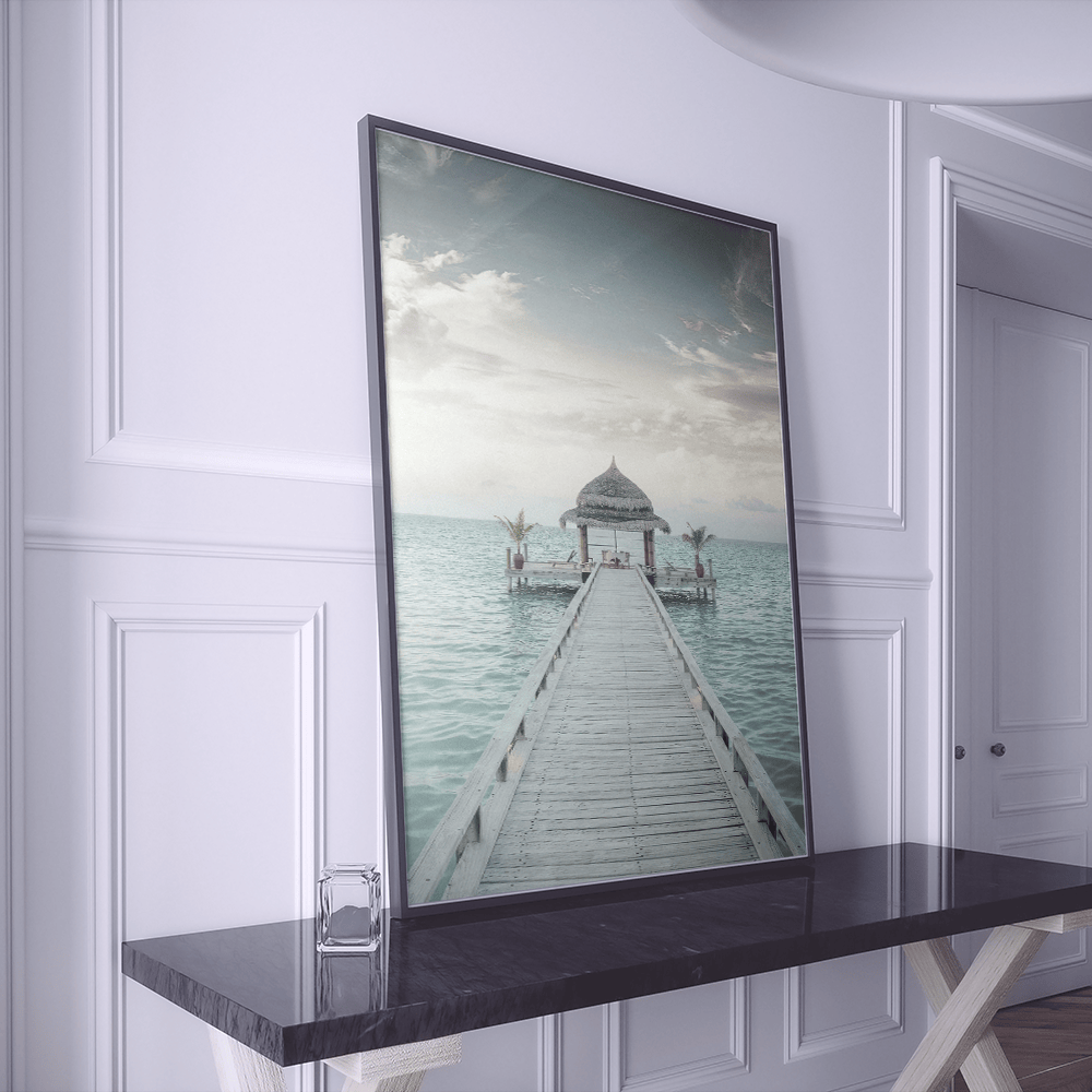 Versetzen Sie sich mit diesem atemberaubenden Kunstwerk in die Ruhe. „Blue Ocean“ fängt eine ruhige Promenade ein, die zu einem malerischen Pavillon führt. Das Kunstwerk umrahmt wunderschön die azurblauen Wellen, die sanft die Promenade streicheln. Eine ruhige Weite aus Meer und Himmel schafft eine harmonische Kulisse. Es ist eine visuelle Symphonie, die Sie einlädt, in einen Moment der Ruhe einzutreten. Wo die Welt langsamer wird und die Schönheit der Natur im Mittelpunkt steht.