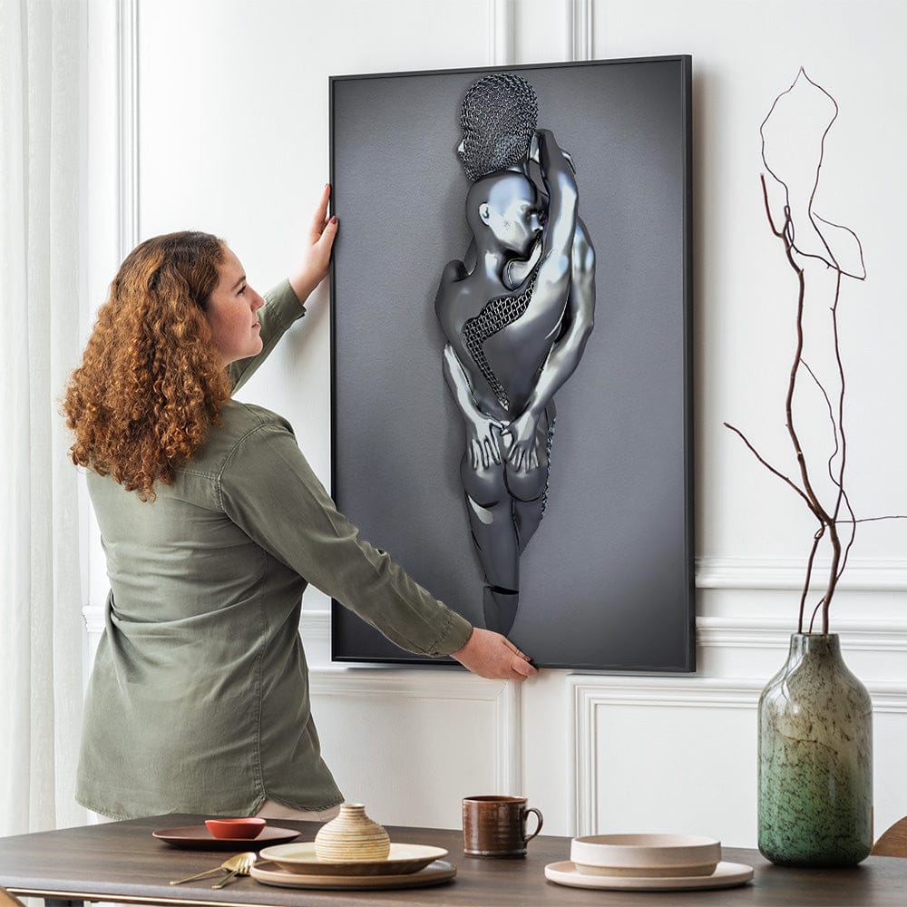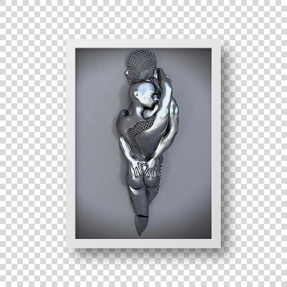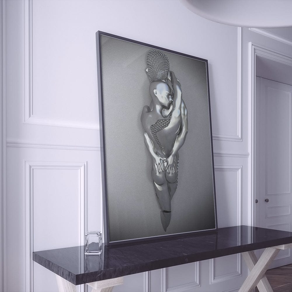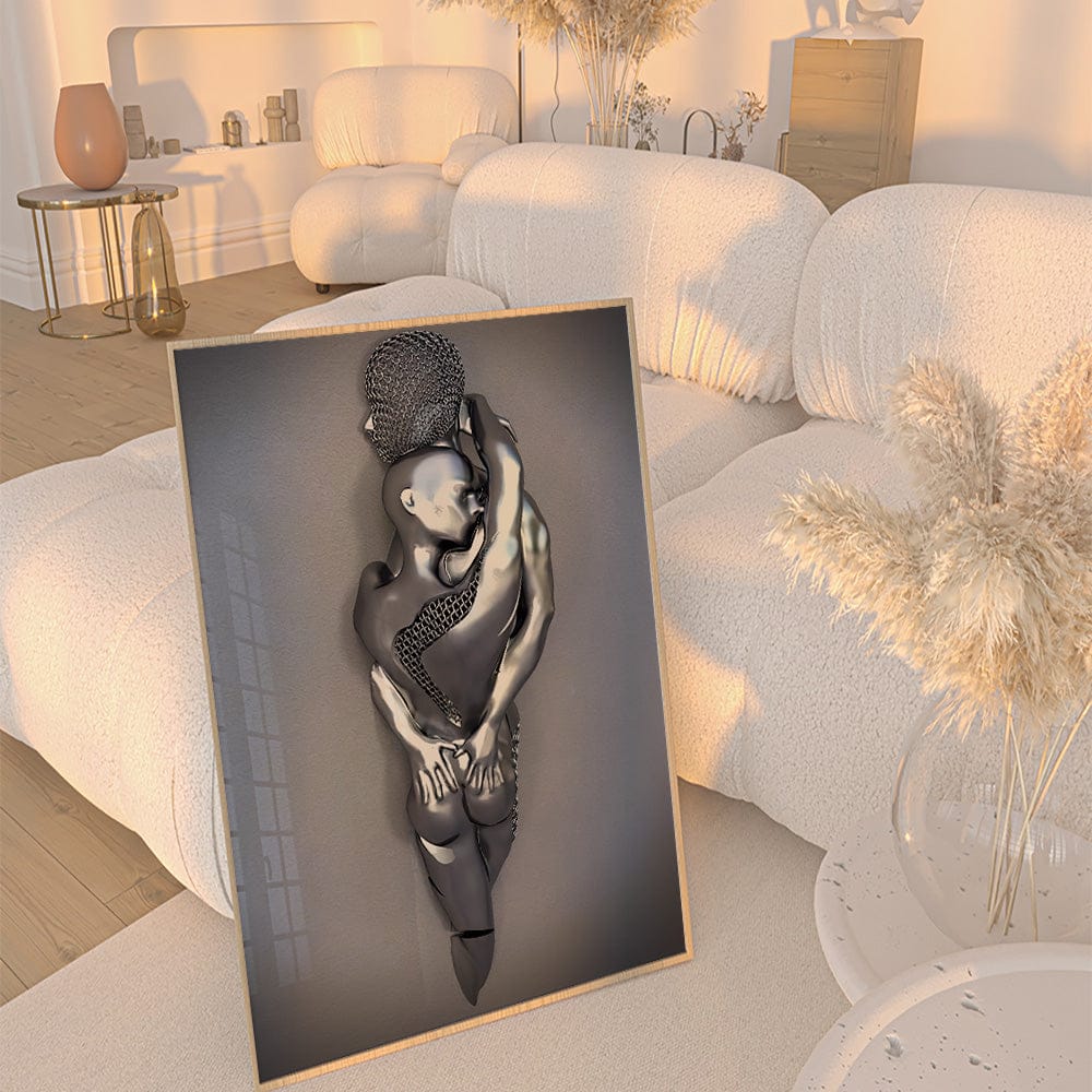Ein faszinierendes Gemälde ewiger Liebe und Verbundenheit. Zwei metallische Figuren; in einer leidenschaftlichen Umarmung gefangen. Eine Verkörperung tiefer Zuneigung und Einheit. Vor einem ruhigen grauen Hintergrund vermittelt das Kunstwerk ein Gefühl der Zeitlosigkeit. Symbol für die unzerbrechliche Bindung zwischen diesen Liebenden.