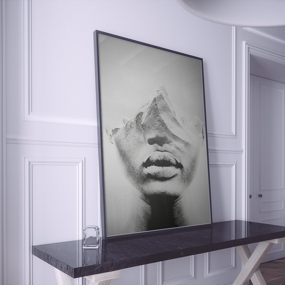 Begeben Sie sich mit „The Edge“ auf eine fesselnde Reise. Dieses bemerkenswerte Schwarz-Weiß-Kunstgemälde steht an der Schwelle zwischen Schöpfung und Formlosigkeit. Präsentation einer unvollendeten Skulptur eines menschlichen Gesichts. Das Spiel von Licht und Schatten wird durch die neutrale Farbpalette verstärkt. Entführt Sie in einen Moment, in dem die künstlerische Entwicklung erstarrt ist. Eine ideale Ergänzung für Ihr Wohnzimmer, da sie sowohl Interesse als auch Nachdenken weckt.