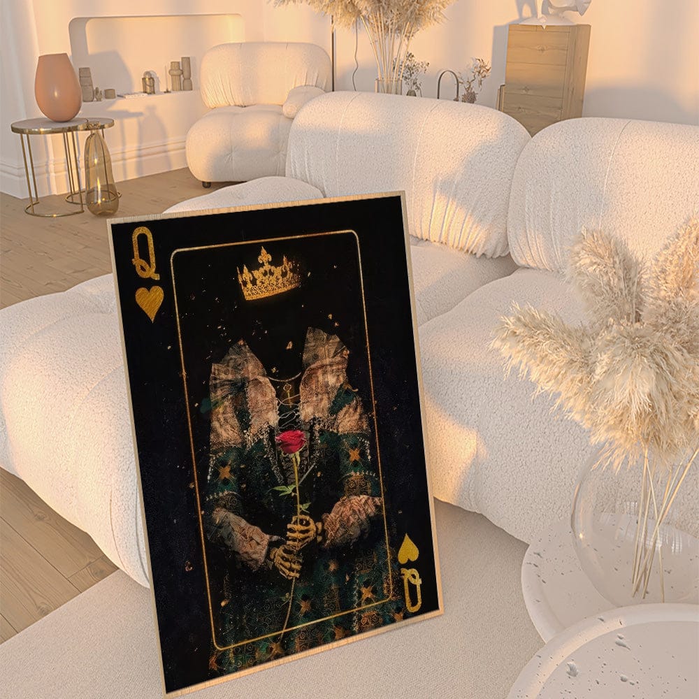 Welcome to the eerie world of "Queen of Hearts," where intrigue and elegance combine in a captivating portrayal. This artwork depicts a faceless queen from a deck of cards, dressed in a captivating black and gold theme. A resplendent golden crown and a royal gown.. Her hands, transformed into golden skeletons, delicately hold a vibrant red rose, representing passion and mystery.
