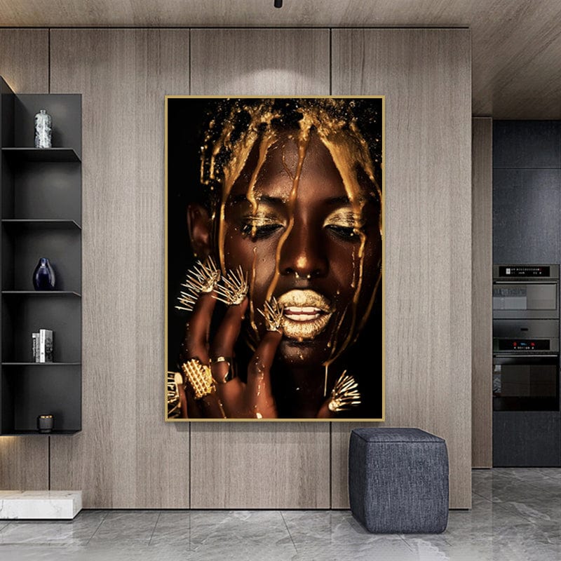Verwöhnen Sie Ihren Raum mit dem Reiz von „Belma Belma“, einem sinnlichen Porträt, das die Sinne fesselt. Stellen Sie sich eine Frau vor, die in flüssiges Gold gebadet ist und deren Essenz verführerisch über ihr Gesicht tropft. Dieses exquisite Kunstwerk ist maßgeschneidert für Ankleidezimmer oder Schlafzimmer und schafft eine Atmosphäre von Faszination und Raffinesse.