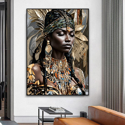 Lassen Sie sich von „Ensitti“ verzaubern. Dieses atemberaubende Porträt fängt die Essenz kosmischer Eleganz ein. Der tiefschwarze Teint der Frau strahlt eine zeitlose Anziehungskraft aus. Mit Gold verziert, das ihre Gesichtszüge betont. Sie strahlt einen ätherischen Glanz aus, der den Betrachter in seinen Bann zieht.