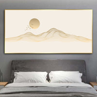 Fine golden lines ripple across soft beige, forming undulating mountains that seem to breathe under a vast, calm sun. A flock of birds arcs gracefully through the open sky, a whisper of motion against stillness.
