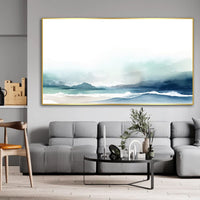 This painting captures the serene allure of a misty beach, where blue waves gently meet the white sands under a blanket of fog. The cool, calming atmosphere invites a sense of peaceful solitude.