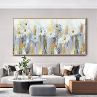Soft white blooms sway gently above textured strokes of gold and cool grey. The petals appear almost sculpted, bursting from the canvas with radiant charm and subtle movement. Gold accents glimmer throughout, adding warmth and contrast to the dreamy palette.