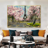 Fall in love with the romance of “Paris Blooms.” This exquisite painting transports you to a serene park in Paris, where the Eiffel Tower stands majestically amidst a sea of blossoming trees. As the soft pink petals drift gently in the breeze, the scene radiates the quintessential charm and elegance of the City of Light.