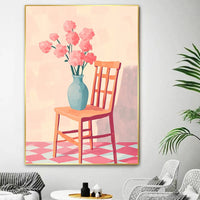 It whispers elegance through every brushstroke. This artwork radiates understated beauty. A rustic wooden chair holds a tranquil blue vase brimming with soft pink carnations, set against a dreamy backdrop of peachy tones. The checkered floor below adds a touch of whimsy and balance to the composition.