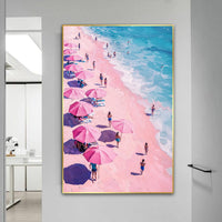 This artwork captures the whimsy of a dreamy shoreline where pink umbrellas offer shade and relaxation, while the turquoise sea beckons you to unwind. The playful contrast between the soft pink hues and the shimmering ocean evokes feelings of joy and serenity.