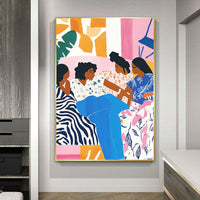 Vibrant hues of pink, blue, and orange surround four women immersed in the intimacy of conversation, each adorned in bold patterns that reflect their individuality. Lush botanical elements and abstract forms frame the scene, adding warmth and harmony.
