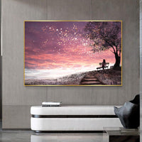 A solitary figure sits on a bench, embraced by the branches of a blooming tree, as a staircase leads into the glowing horizon. The soft hues of lavender, pink, and gold create a dreamscape of quiet wonder.