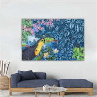 A vibrant toucan perches among deep blue foliage, its golden beak slicing through a tapestry of pink and green. Textured strokes bring the jungle to life, where wildflowers bloom and lush leaves whisper secrets of the tropics.