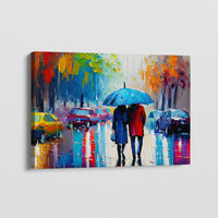 This evocative piece captures the beauty of two souls sharing an intimate moment under a canopy of colorful leaves. The vibrant hues and reflective streets create a symphony of emotions, perfect for those who cherish the poetry of quiet moments. Let it transport you to a world where the air is crisp, and every drop whispers a secret.