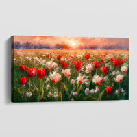 Savor twilight beauty with "Draemy Tulips." This painting captures a field of wild tulips still blooming as dusk settles in. The rich red hues create a serene, almost magical atmosphere, inviting you to pause and reflect.