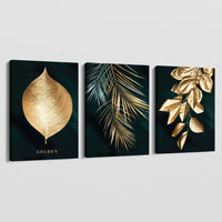 "Experience the allure of autumn with "Gold Leaves,". This exquisite artwork features three different frames. Each gracefully showcasing a golden autumn leaf against a dark, black background. The rich contrast between the radiant gold and the deep darkness creates a mesmerizing effect. This evokes the nostalgia of crisp autumn days and the gentle rustling of falling leaves.