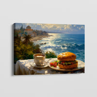 Savor a slice of vacation bliss with “Hearty Buns.” This vibrant painting captures the simple joy of a beachside breakfast, where a delicious hamburger and a steaming coffee await under the sunny dawn. The tranquil sea and golden sands form the perfect backdrop, evoking the serene pleasure of a leisurely morning on vacation.