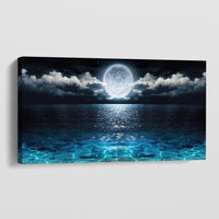 A captivating artwork capturing the serene moment of a full, luminous moon ascending over pristine blue waters. Perfect for your living room or master's bedroom, this piece adds a touch of celestial elegance to your personal space.