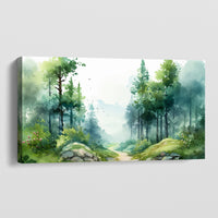 Behold the sentimental lure of "Watercolor Path." This artwork depicts a lush, misty pathway with the cool, crisp feel of a morning breeze. The vibrant trees and soft atmosphere transport you to a simpler time, bringing back childhood memories. Its gentle hues and serene composition create a calming presence, ideal for bringing a touch of nature's tranquility into your space.