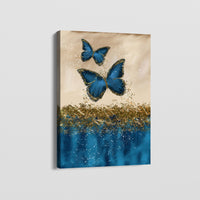 This enchanting piece captures the delicate elegance of butterflies in flight, symbolizing freedom and the magic of change. The rich blues and golden accents radiate a sense of wonder, perfect for those who appreciate nature's fleeting, ethereal moments. Let its movement and mystery inspire your space.