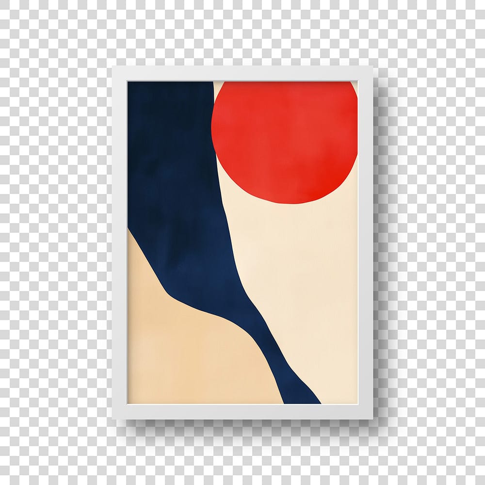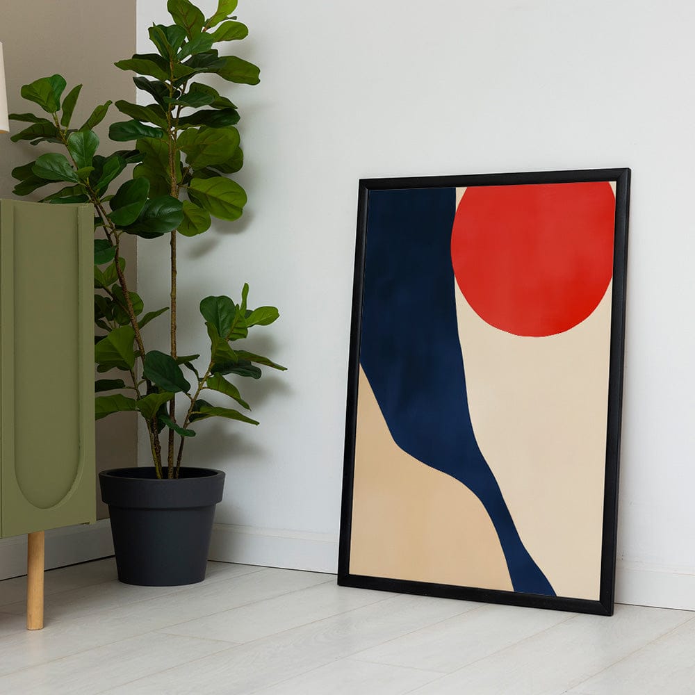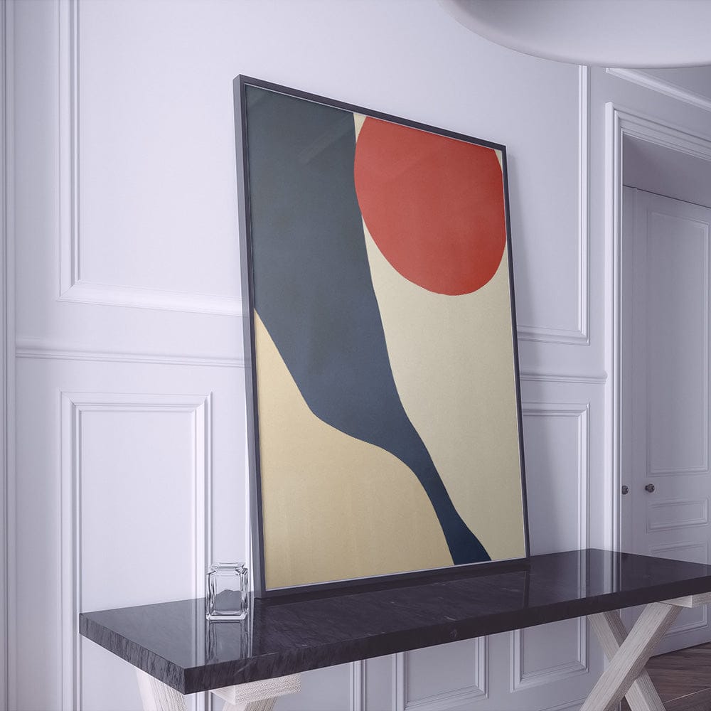 A vibrant red orb dominates the canvas, offset by deep navy curves that carve through soft beige tones. The minimalist composition plays with shapes and contrast, evoking a sense of rhythm and intrigue.