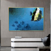 This artwork immerses you in an ethereal underwater realm, where graceful angelfish glide freely through a tranquil seascape. Imagine the calm and serenity this painting brings, evoking a sense of peaceful escape and natural beauty.