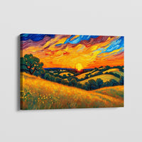 The day comes to a gentle close as golden fields sway beneath the fiery glow of the setting sun. Rolling hills stretch into the horizon, their shadows deepened by a brilliant sky swirling with orange, red, and sapphire. Every brushstroke captures the movement of wind, light, and time, turning an ordinary evening into a moment of wonder.