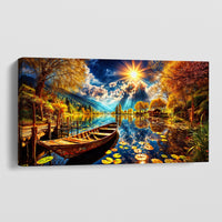 Bathed in radiant sunlight, a quiet lakeside scene bursts with warmth and wonder. A rustic wooden boat rests gently on lily-dotted waters, reflecting the dazzling sky above as golden hues dance across autumn trees and rippling reflections. Every detail shimmers with life—from the serene dock to the sunbeams streaming through clouds—inviting a sense of peace, nostalgia, and stillness in motion.