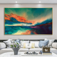 This artwork breathes life into any space with its ethereal blend of warm skies and cold landscapes. Where the sky kisses the horizon, playful colors dance and reflect on serene waters, creating a mesmerizing, dreamlike vista. It evokes the gentle promise of a new beginning, where warmth meets cool tranquility.