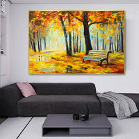 This artwork envelops you in the golden glow of a forest, where time seems to pause under the canopy of vibrant leaves. The peaceful bench invites moments of reflection, as nature transitions into its most enchanting phase. Perfect for adding warmth and a sense of nostalgia to your home, it evokes the quiet beauty of fall, filled with rich colors and tranquil solitude.