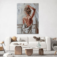 Get ready to awaken your senses with "From the Window." This captivating painting depicts a woman gazing outside, her body wrapped in bed sheets, holding her hair in a tender morning moment. The scene is both dramatic and romantic, capturing the quiet beauty of dawn. Perfect for any space, this artwork adds a touch of intimate elegance and serenity.