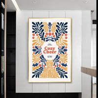 Wrap your walls in warmth and joy with this festive artwork. Featuring a symmetrical folk-inspired design, this piece is filled with stylized winter foliage, holly leaves, berries, and bold botanical shapes in deep navy, soft gold, and cheerful red. At the center, the message “Cozy Cheer” and holiday wishes add a heartfelt touch perfect for the season.