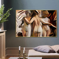 The artwork reveals three abstract figures, their flowing contours melding seamlessly into earthy tones and layered textures. Hints of light and shadow weave through, adding depth and movement to the composition.