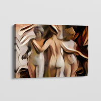 The artwork reveals three abstract figures, their flowing contours melding seamlessly into earthy tones and layered textures. Hints of light and shadow weave through, adding depth and movement to the composition.