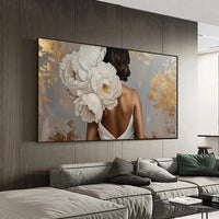 A poised figure in a flowing white gown turns away, her back adorned with delicate, oversized white blooms. Hints of gold brushstrokes glimmer against a muted gray background, adding an air of sophistication and refinement.
