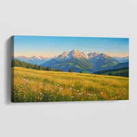 Golden fields unfurl beneath a sky brushed with the softness of dawn, where wildflowers scatter like whispers across the meadow. The distant mountains rise in quiet strength, their peaks etched in sunlight and shadow, creating a harmony of stillness and grandeur. Each stroke carries the warmth of summer air, capturing the timeless embrace where earth and sky meet.