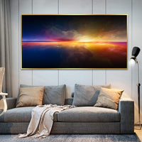 This mesmerizing artwork captures the delicate fusion of night fading into a vibrant, hopeful morning. Hues of deep indigo, radiant orange, and golden yellow meet seamlessly along the horizon, illuminating the sky with an ethereal glow. It’s an invitation to witness the quiet majesty of a world reborn each day.