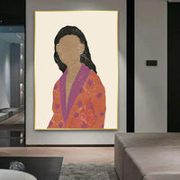 A faceless woman stands dressed in a vibrant orange robe adorned with violet flowers, exuding both softness and strength. The textured layers and muted backdrop emphasize her poise while leaving room for the imagination to wander.