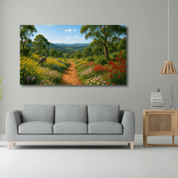 A quiet path winds through the heart of the great outback. Kangaroos wander freely while wildflowers bloom in radiant hues of yellow, red, and pink. Rolling hills and endless greenery stretch toward the horizon, creating a serene escape that feels alive with beauty and calm.