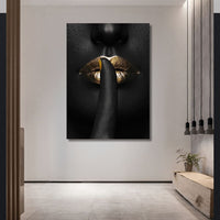 Bring mystery and allure to your space with "Hush Honey." This captivating closeup features golden lips against a black-as-space background, with a woman's finger gesturing for silence. The striking contrast and elegant composition evoke a sense of quiet sophistication and intrigue.