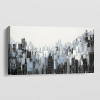 Towering skylines shimmer with light and shadow, capturing the restless rhythm of city life. Dynamic and alive, the composition evokes metropolitan energy and the pulse of modern architecture.